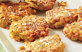 4 ½ cups shredded zucchini, salt, ¾ cup self rising flour, 2 lightly beaten large eggs, 1 cup thinly scaled scallions (light and dark parts only), ¼ cup vegetable oil.